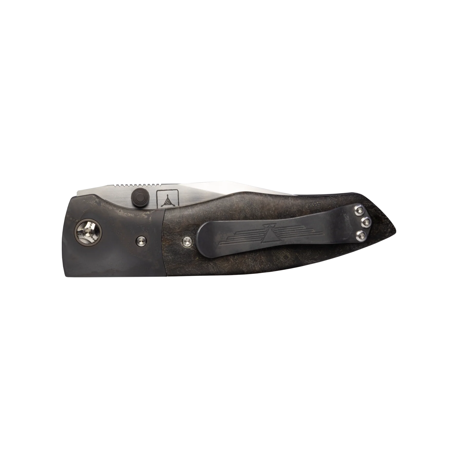 The Archon boasts antiqued darkened titanium bolster and clip, which contrasts with the satin finished titanium custom pivot and screws. The knife's standout feature lies in its rare burlap micarta slabs, featuring our signature triple fullers. This captivating combination of materials not only ensures strength and durability but also adds a unique touch of elegance and exclusivity.
