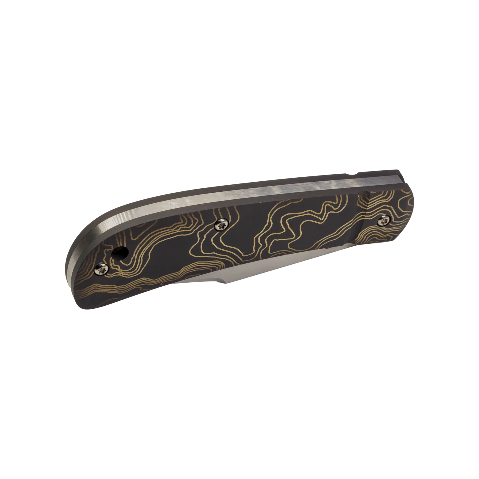 Blasted and darkened titanium handle slabs with laser etched topo pattern